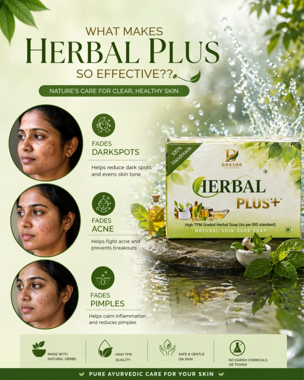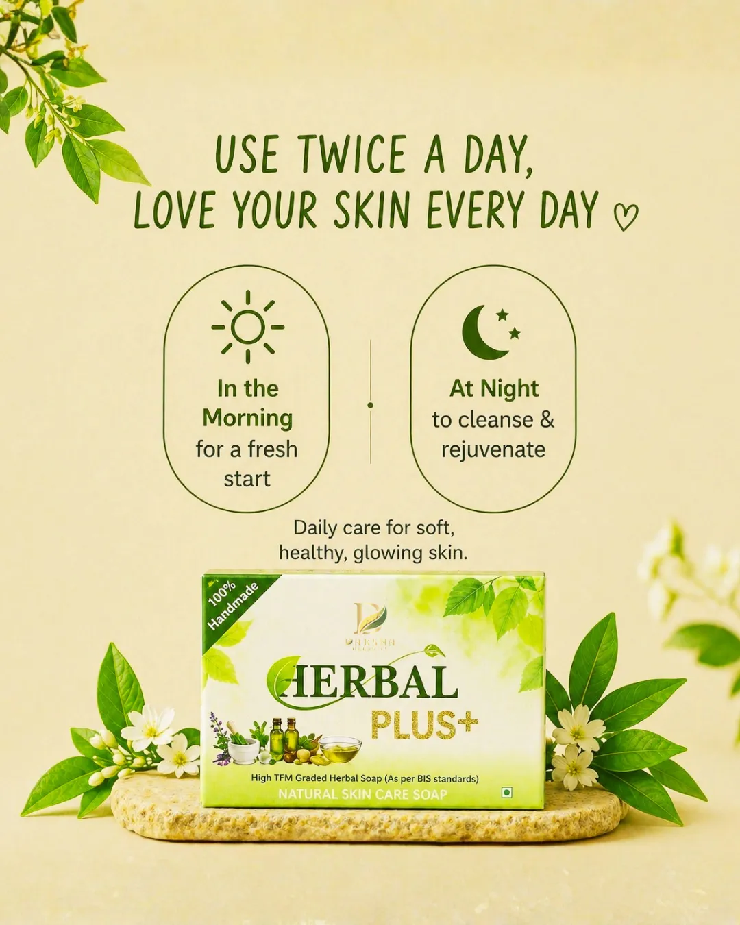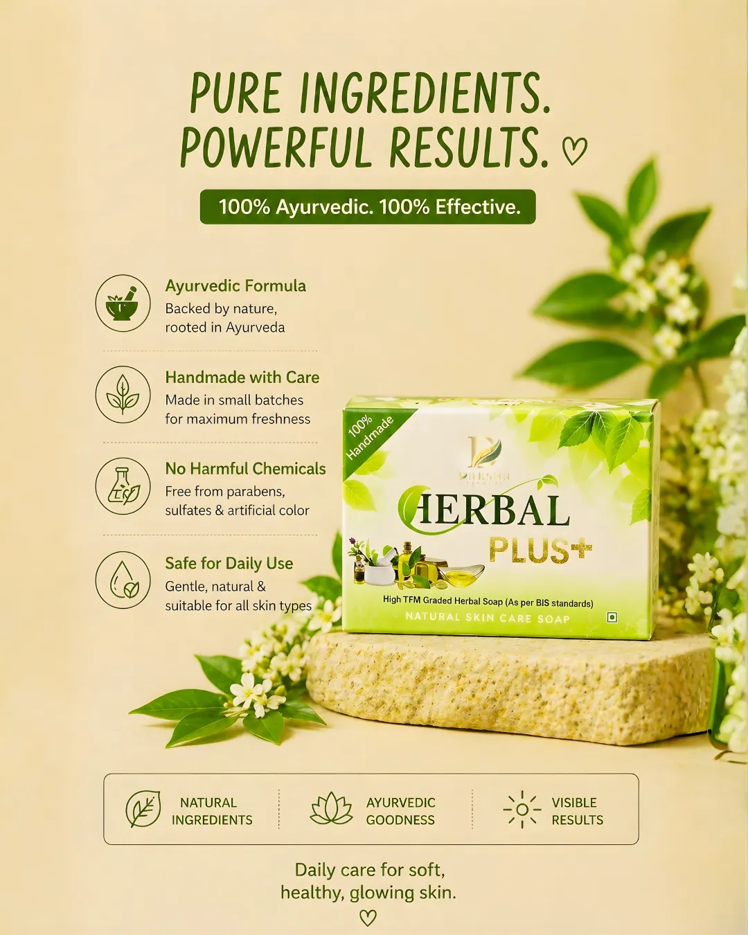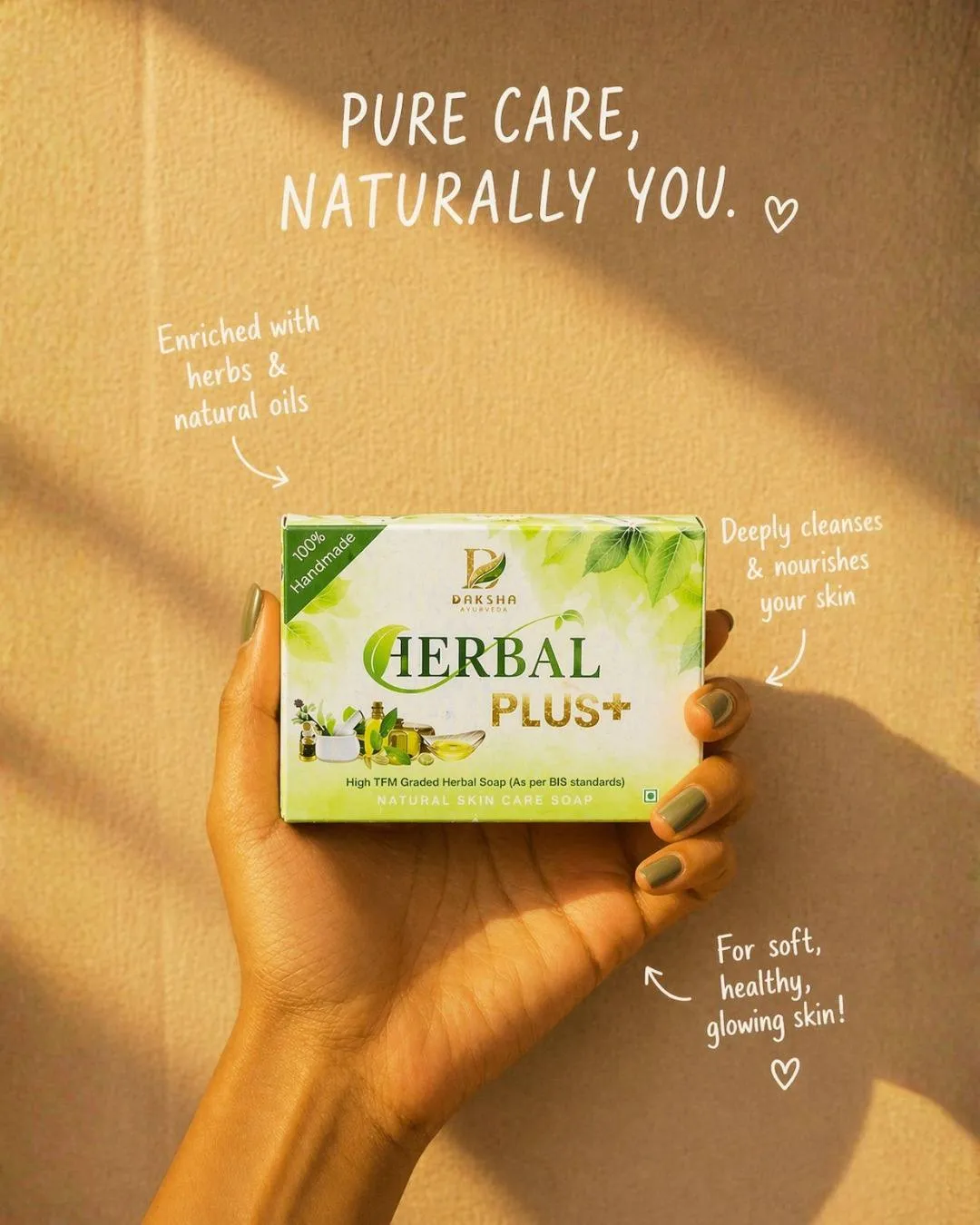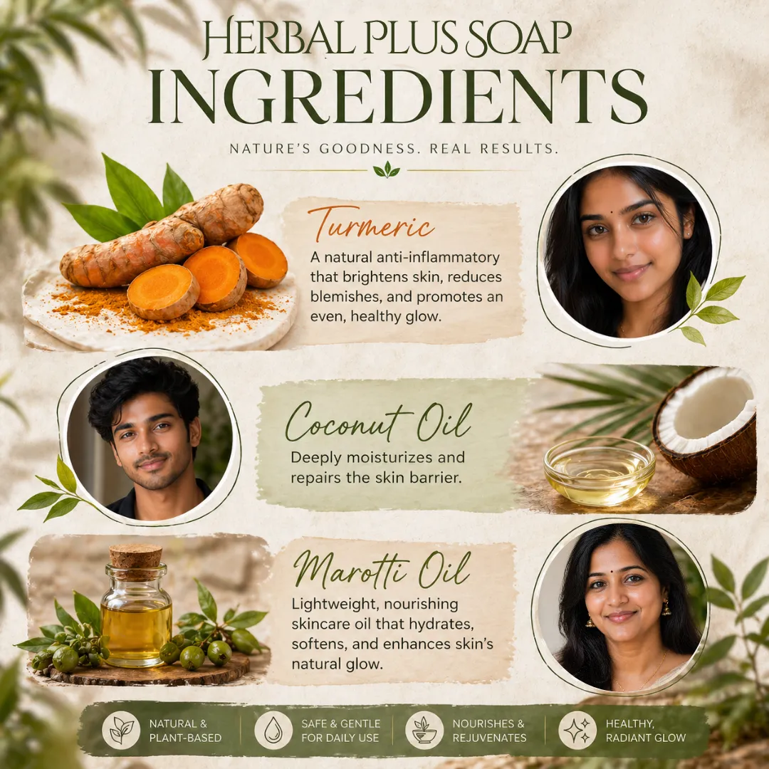 Herbal Plus Soap is formulated using a high TFM (80%+) Ayurvedic base with pure coconut oil as the primary ingredient, ensuring effective cleansing without stripping natural moisture.